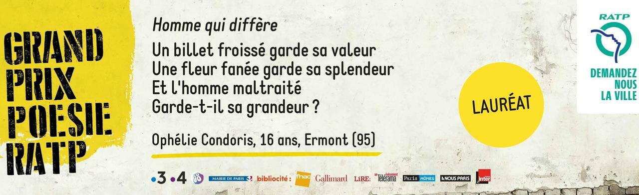 « Un billet froissé garde sa valeur, une fleur fanée garde sa splendeur, et l’homme maltraité, garde-t-il sa grandeur ? » Si vous prenez le métro pendant les deux mois d’été, vous aurez peut-être la chance de lire ces vers écrits par Ophélie Condoris. Cette jeune (16 ans) habitante d’Ermont fait partie des dix lauréats du Grand Prix poésie de la RATP. Son poème, retenu parmi 11 133 candidats, sera donc exposé sur environ 10 000 emplacements. Une belle récompense pour cette élève du lycée Van-Gogh d’Ermont, qui passe en Terminale Économique et Sociale (ES), et fut « surprise » de figurer parmi les vainqueurs.